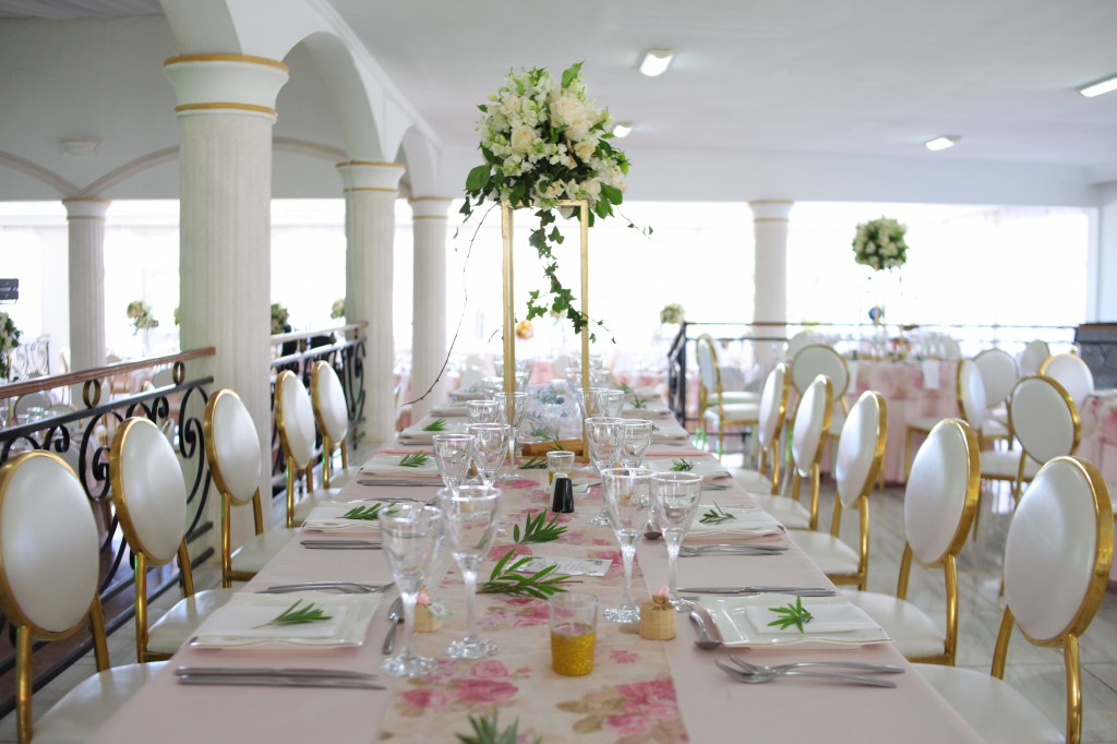 Et que dire de la table de mariée, jonchée de fleurs. Sans compter les majestueux bouquets sur chaque table. On voit bien là, la touche spéciale de » T and Co ».