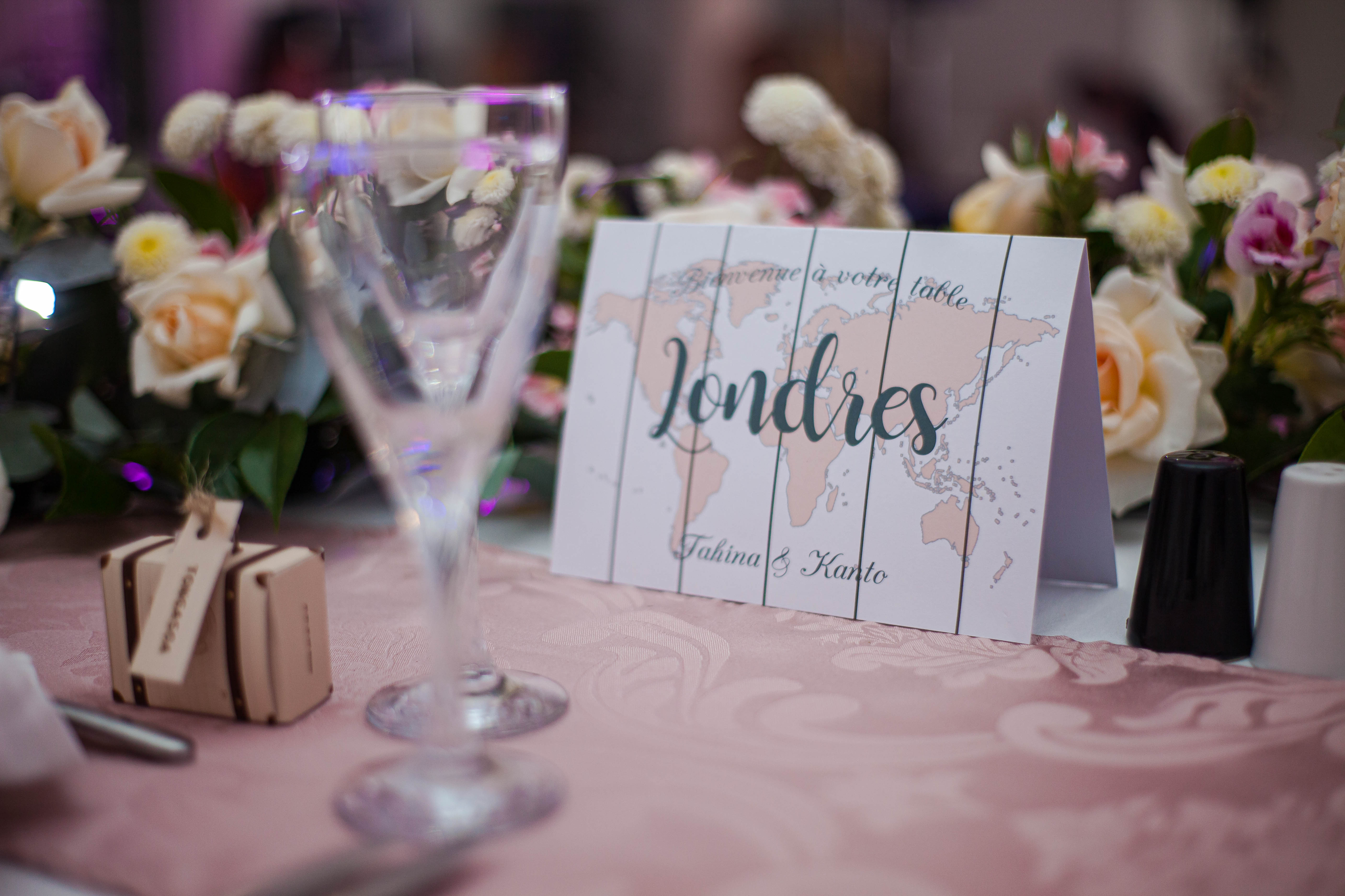 La salle de réception, s’habille sous le thème du voyage avec la couleur blanche et nude. La décoration florale est assurée par Tif Déco, et le gâteau est concocté par La Chocolaterie Robert.
